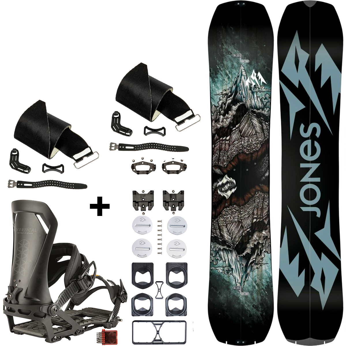 JONES Mountain Twin 3D Split & KHOLA Peak UNI + NITRO Vertical ST & pucks x SPARK R&D | splitboard & skins + bindings & pucks