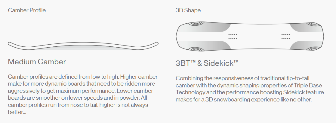 3BT™ + Sidekick™ – Combining the responsiveness of traditional tip-to-tail camber with the dynamic shaping properties of Triple Base Technology and the performance boosting Sidekick feature makes for a 3D snowboarding experience like no other.