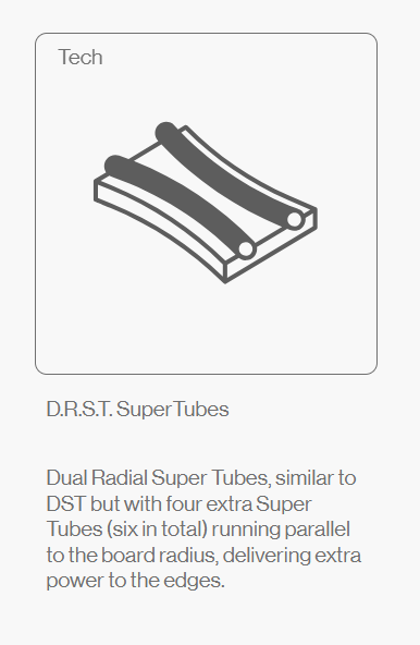 D.R.S.T. Super Tubes – Dual Radial Super Tubes, similar to DST but with four extra Super Tubes (six in total) running parallel to the board radius, delivering extra power to the edges.