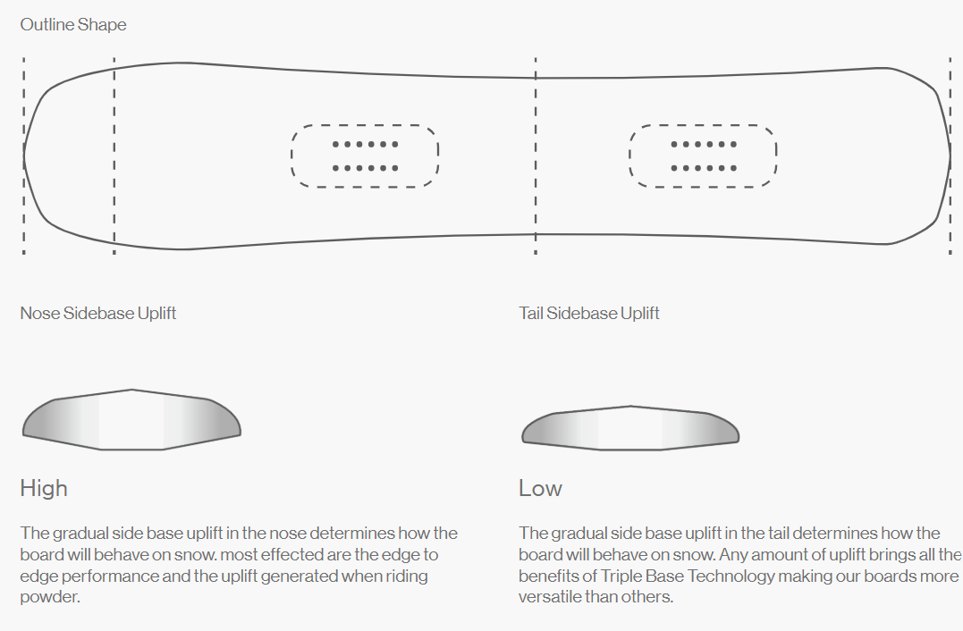 Medium Camber – Camber profiles are defined from low to high. Higher camber make for more dynamic boards that need to be ridden more aggressively to get maximum performance. Lower camber boards are smoother on lower speeds and in powder. All camber profiles run from nose to tail. higher is not always better...
